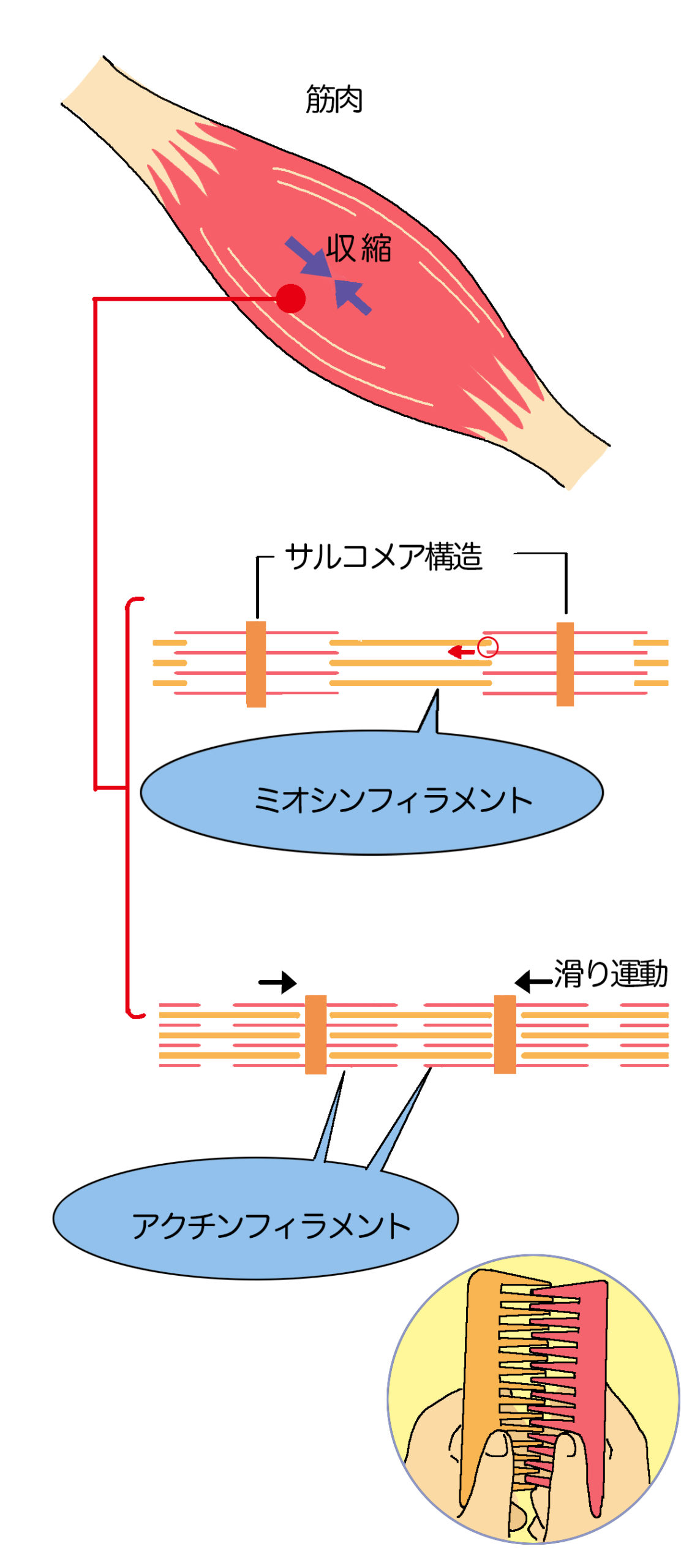 では、筋肉の「収縮」はどのように起こるのでしょうか。実はこれはちょっとむずかしい。ここで小道具を使った説明をします。髪の毛をとく「くし」を思い出してください。くしを左手と右手に1本ずつ持った状態で、くしのとく側、つまり歯のある側どうしを併せていくと、くしの1本1本の歯が互いに相手の歯の間に入り込む。すると、2本のくしの距離が近づきます。