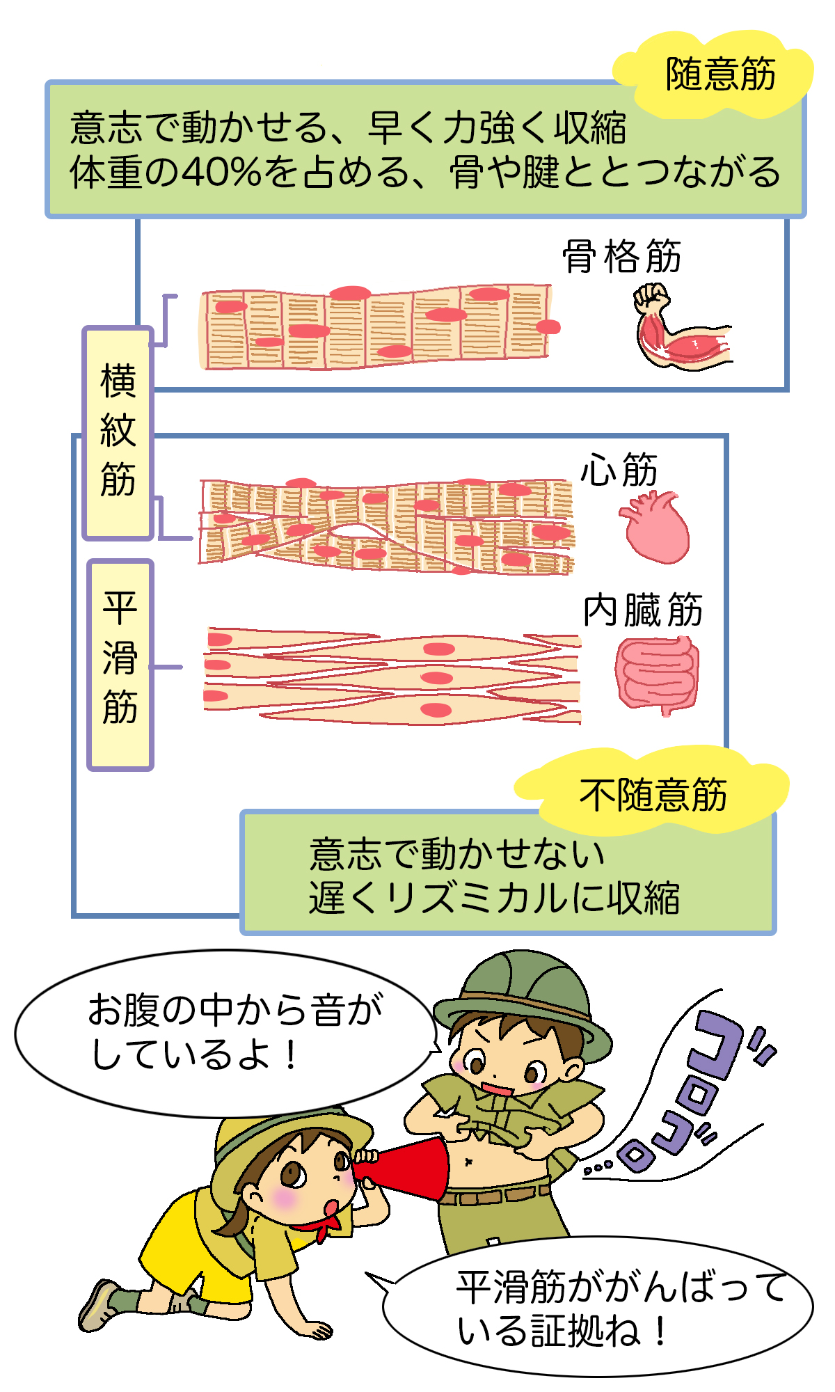 三つ目は、主に内臓にある白っぽい色の筋肉、「平滑筋」です。たとえば、胃や腸が活発に動くのは平滑筋のはたらきによるものです。お腹に耳をあてると、お腹の中の音がよく聞こえます。「ゴロゴロ、グーグー」。これらは胃や腸が元気よく動いているために生じる音です。ちなみに平滑筋は、胃や腸以外にも、目、皮膚、血管、子宮など、さまざまなところにあります。