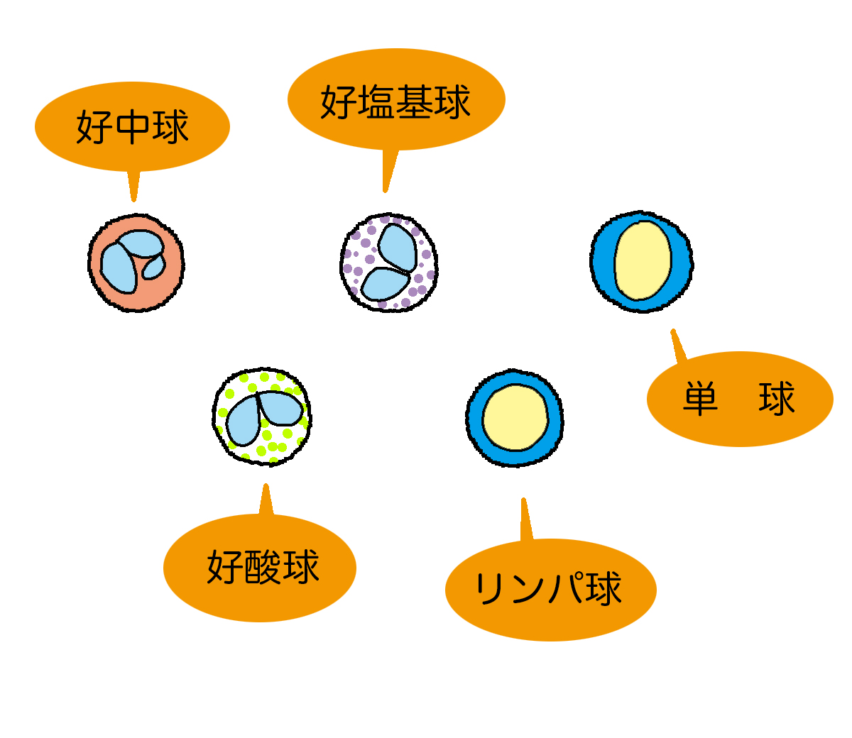 白血球は「白」と書くけれど、実際の色は「白」ではなく、ほぼ透明です。赤血球は1種類しかないのに対して、白血球は好中球、好酸球、好塩基球、リンパ球、単球などたくさんの種類があります。どの種類の白血球もあなたの体の中に侵入してきたばい菌、ウイルス、寄生虫などの外来生物をやっつけたり、あなたの体の中で発生した細胞の死骸など、いらなくなった物をきれいにお掃除したりします。あなたが病気にならないのはこの白血球のおかげです。