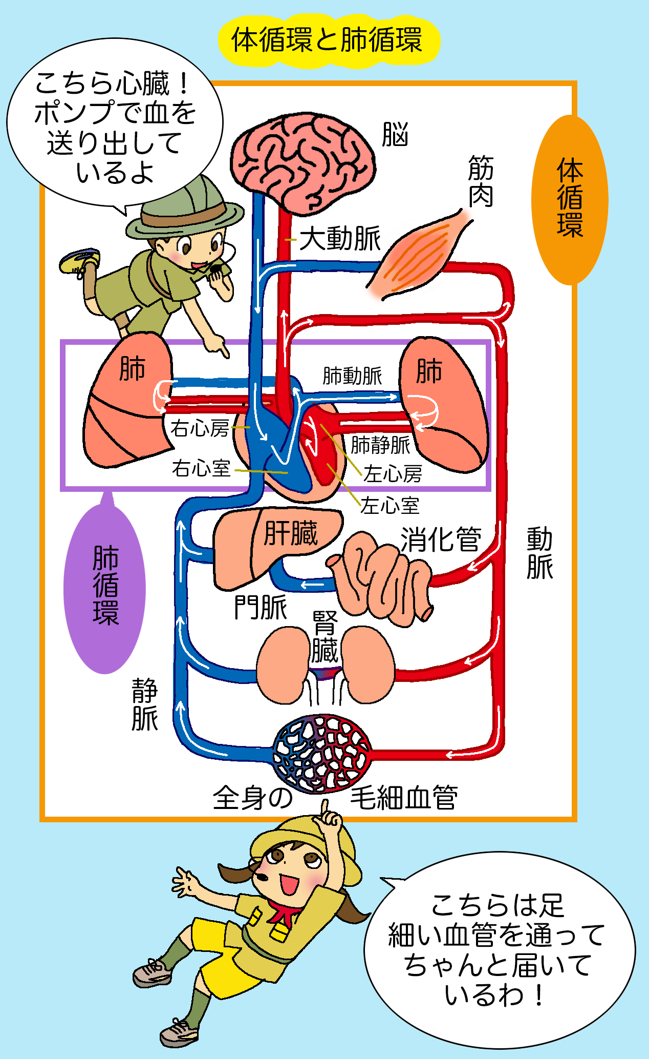 血液は酸素をたくさん含む動脈血と酸素が少ない静脈血となって、体中をいったりきたり、ずっとずっと循環しています。これを循環系と呼んでいます。