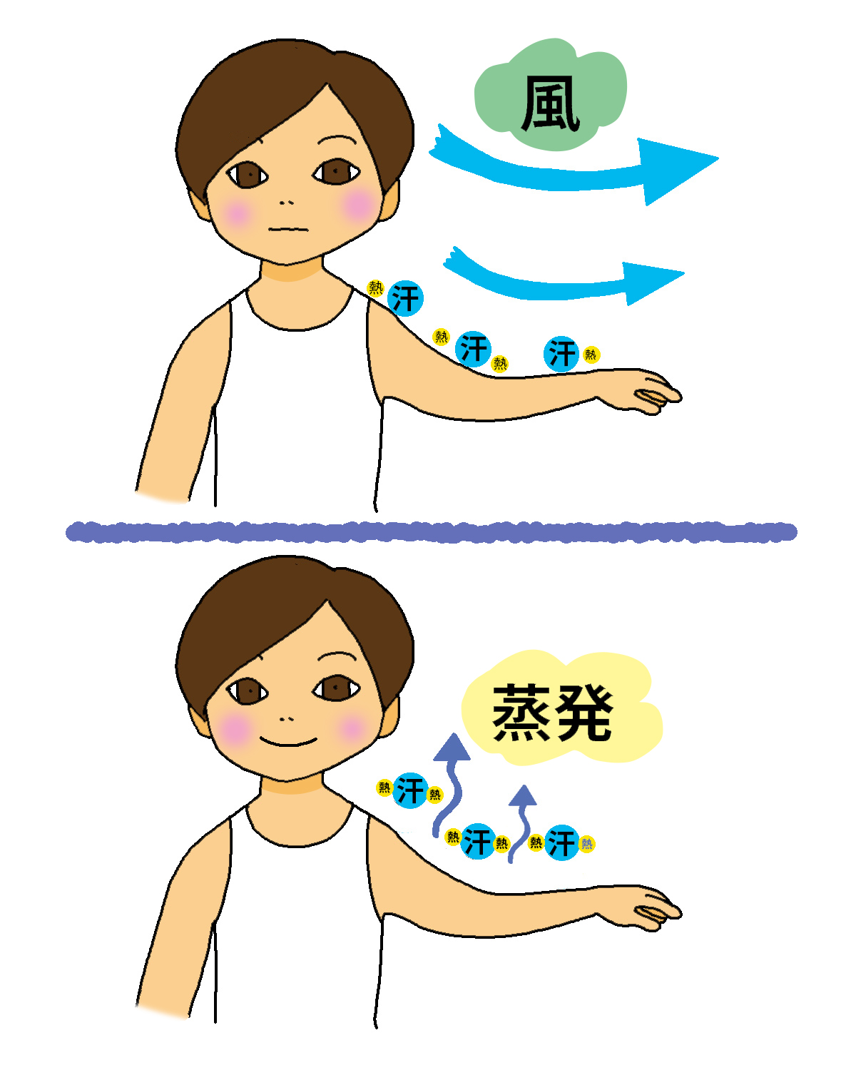 汗が出ると皮膚の表面が濡れます。その汗に含まれる水分が蒸発するとき、つまり、汗の水分が「液体から気体に変化する」とき、水はたくさんのエネルギーを必要とします。そのエネルギーの一部はあなたの体の皮膚の温度が用いられます。言いかえると、あなたの体温が汗にうばわれる。だから、汗が乾くのと同時に、あなたの皮膚の温度が下がり、体が冷えることになるわけです。