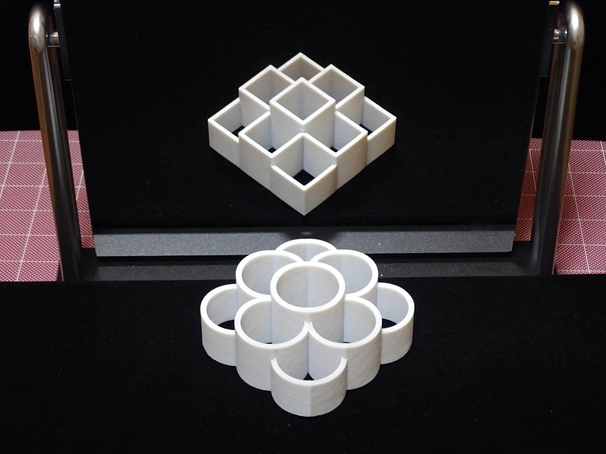 こちらは「丸四角の丘」。変身立体といって、鏡に映すと姿が変わって見える不思議な錯覚だ。手前は丸い立体なのに、奥に映っているのは四角の立体。これは一体どういうこと⁉