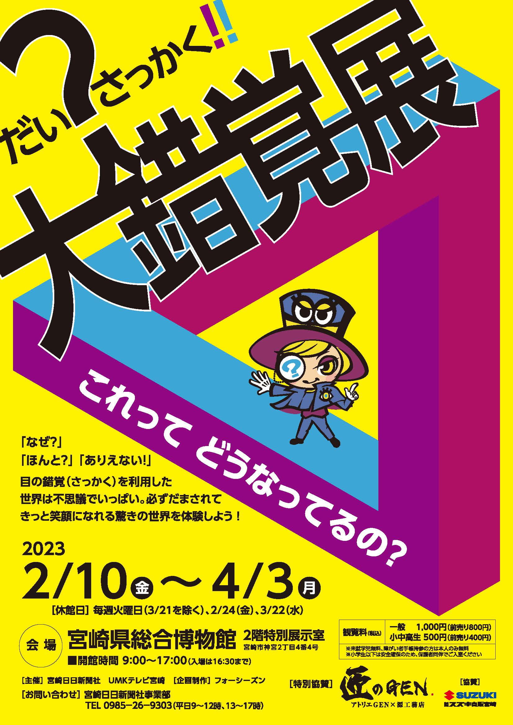 宮崎県総合博物館で「大錯覚展」が開催されるよ。驚きの錯覚作品が約120点集合! あっちでもこっちでも脳がだまされる、不思議な体験を味わいにレッツゴー! ここでは、今回の展示作品の一部を紹介するよ。