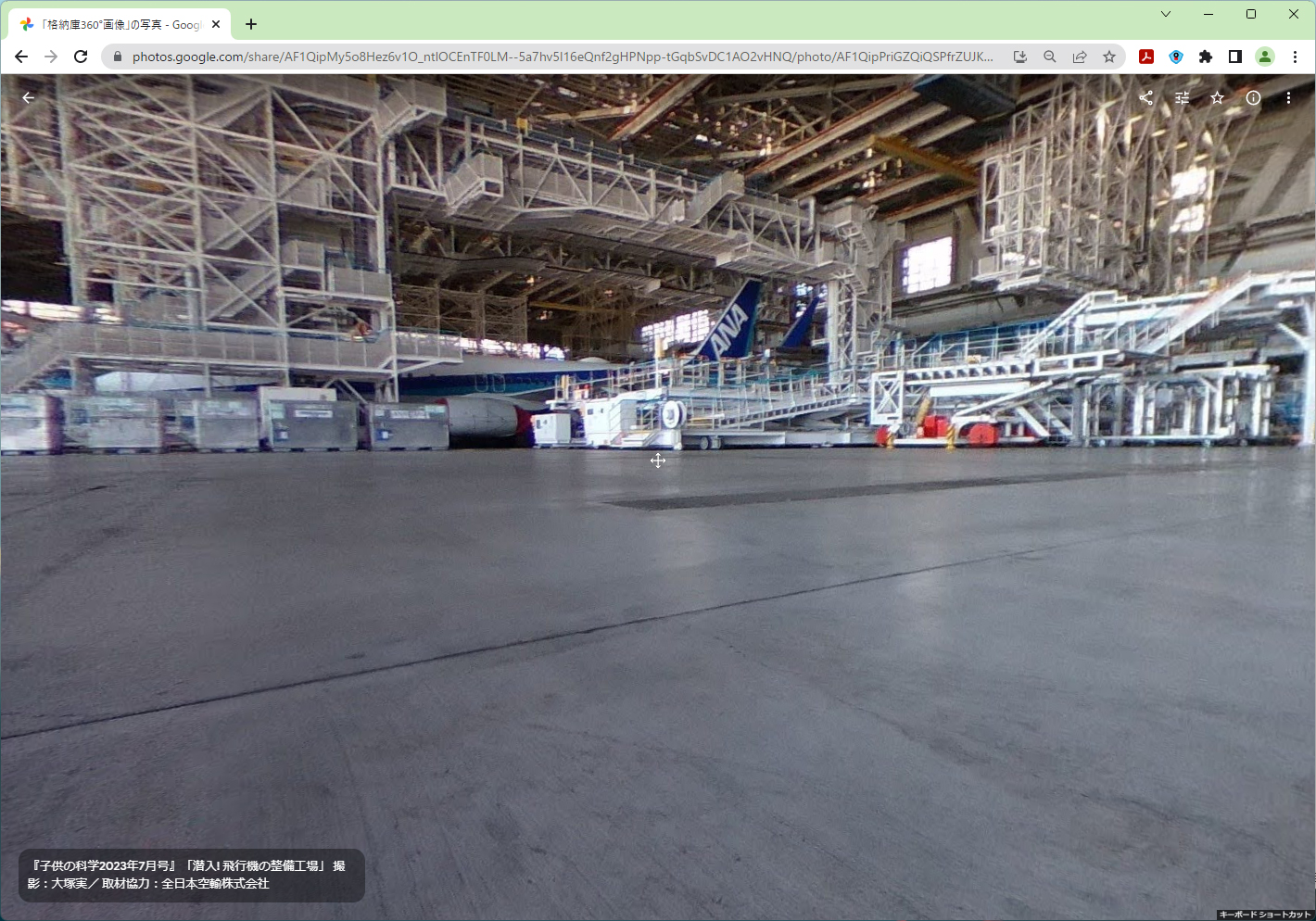 『子供の科学2023年7月号』の「潜入! 飛行機の整備工場」で取材をしたANAグループの広い格納庫を360°カメラで撮影! その写真を見ることができるぞ。