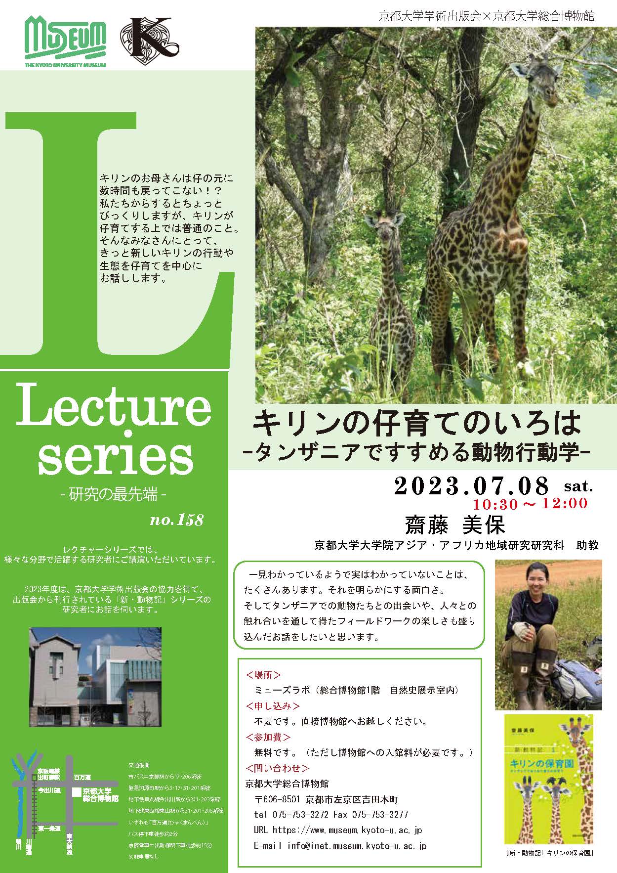7月8日(土)の10時30分~12時に、京都大学総合博物館で講演会「キリンの仔育てのいろは -タンザニアですすめる動物行動学-」が開催されるよ。お話をしてくださるのは齋藤美保先生(京都大学大学院アジア・アフリカ地域研究研究科)。タンザニアをフィールドに、マサイキリンの母親と仔どもの関係を研究しているんだって。先生がどうやってそのテーマにたどりついたのかもとっても気になるね!