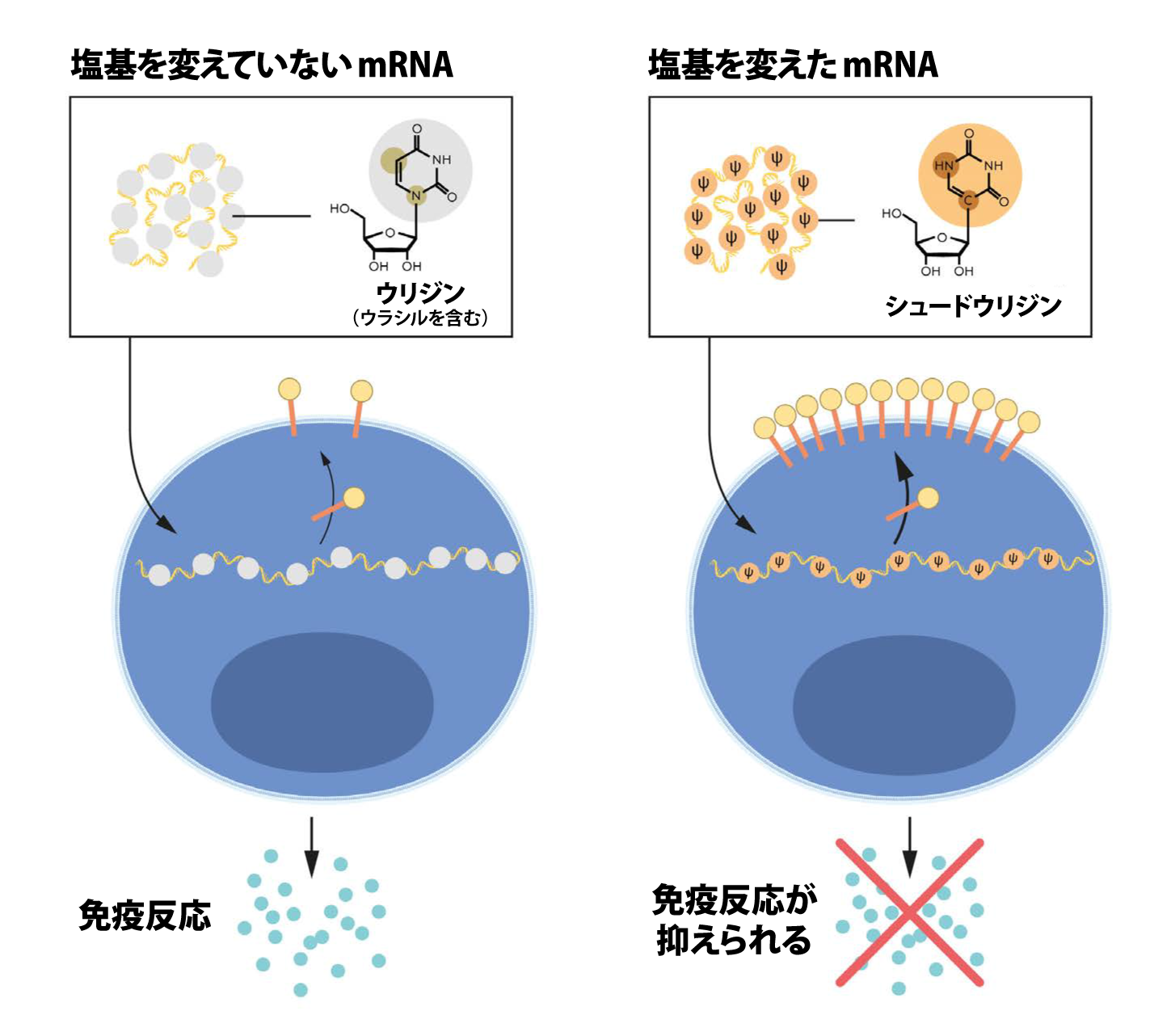 しかし、外から注入するmRNAは異物であるため、免疫によって速やかに排除されます。これではmRNAをワクチンとして利用することはできません。この問題を解決するため、カリコ博士、ワイスマン博士はRNAの遺伝情報を示す4種類の塩基を改変して免疫反応を調べる地道な実験を繰り返しました。その結果、RNAの塩基の1つ、ウラシルをよく似たシュードウリジンと変えると、免疫反応が抑えられることを突き止めました。