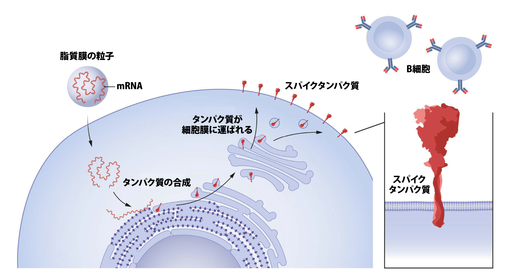 ただし、mRNAは非常に壊れやすい物質であるため、免疫に排除されなくても、簡単に壊れて、ワクチンとして働けなくなります。そのため脂質の膜でできた粒子に包んで保護する方法が取り入れられました。これでmRNAをワクチンにするための基盤技術が揃ったことになります。