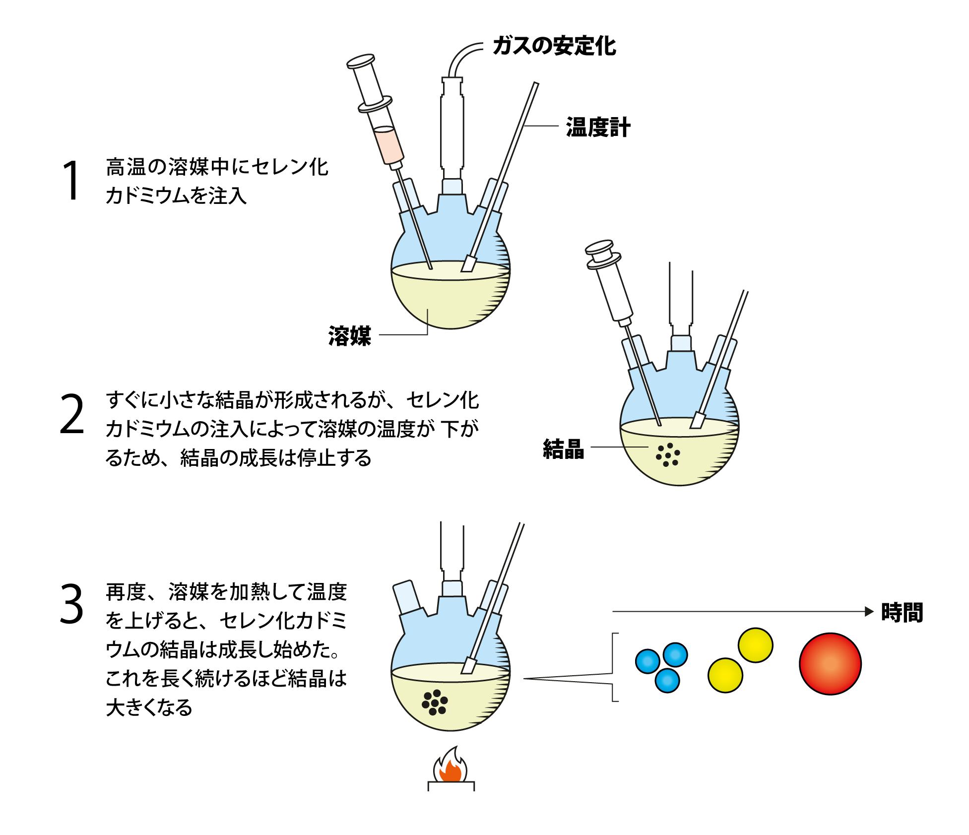 1988年にブラス博士の研究室に加わったバウェンディ博士は、量子ドットをつくる技術の開発に取り組みました。その後、研究拠点をマサチューセッツ工科大学に移して研究を続けたバウェンディ博士は、溶媒中で結晶を成長させる際、温度を調節することにより、求める粒子サイズの量子ドットを製造する技術を確立しました。