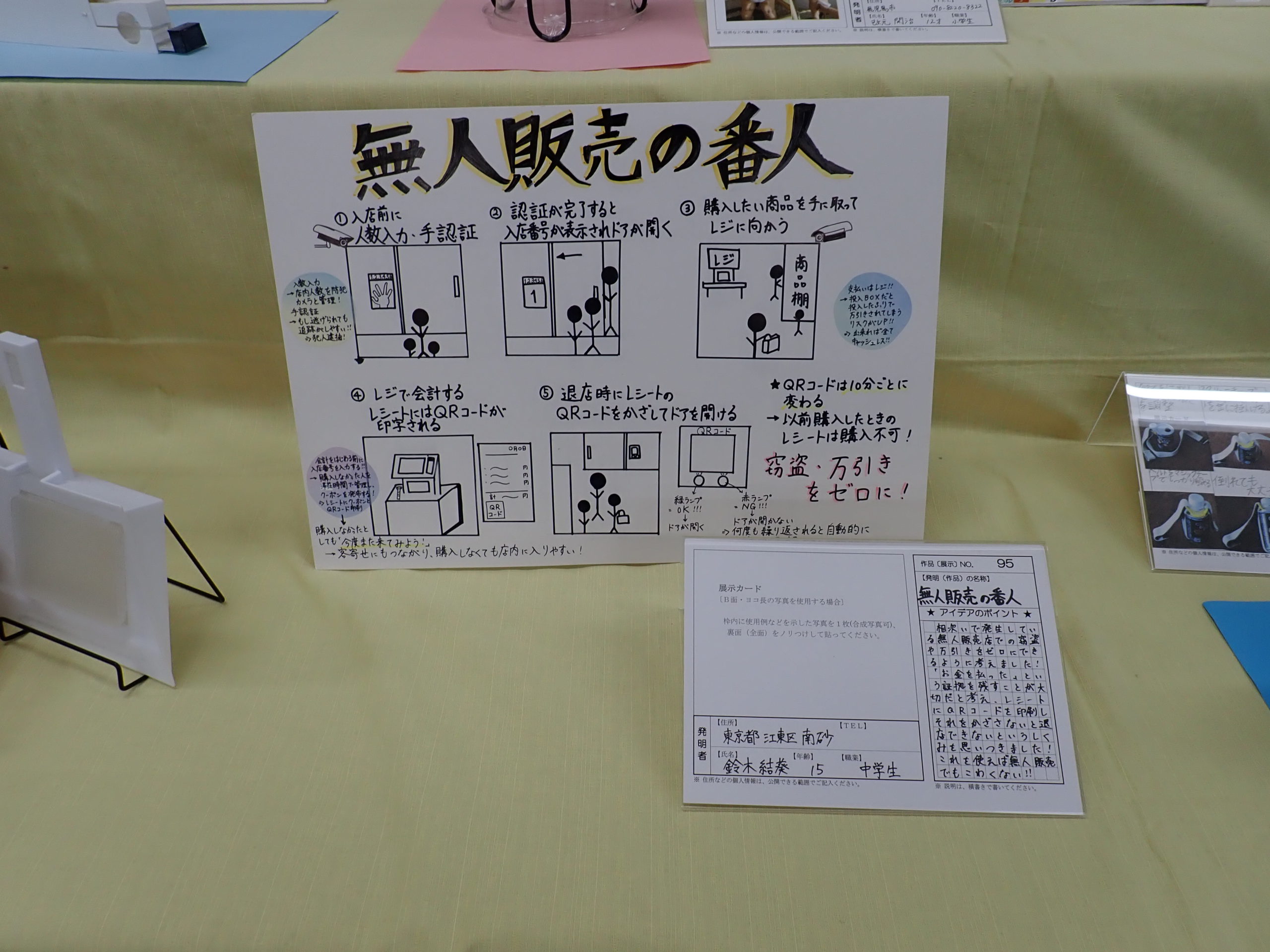 子供たちによる発明とあって、やはりテーマは、学校生活に関する文房具などのアイデアが多いですが、なかには、社会で問題になっている「泥棒対策」や「SDGs」、「お年寄りとのコミュニケーション」に関する発明もあり、アイデアで課題を解決する「発明思考」がすでにかなりのレベルで完成していることを感じさせる作品もありました。