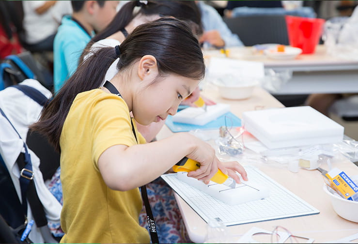 「段ボールをつけるのに、セロテープ、ガムテープどちらがよいんだろう」「自分が乗れるいすをつくるのに、どんな形にすればよいだろうか?」「動く車をつくるために、動かすためにはどんな方法があるんだろう」 など、自らが想像したことを、試行錯誤しながら形にしてくこと=エンジニアリングをするために必要なセンスを身につけます。物理や化学の法則を知ることで、感覚であたらしいものをつくりだすことができてくるでしょう。