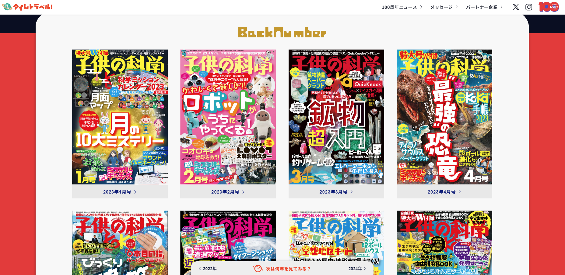 100周年サイトオープン記念企画の2つめは、『子供の科学』1年分のバックナンバー電子版が楽しめるキャンペーンを開催。「2023」と検索してタイムトラベルに出発。表示された2023年の『子供の科学』1月号から12月号までを全ページ読むことができます。