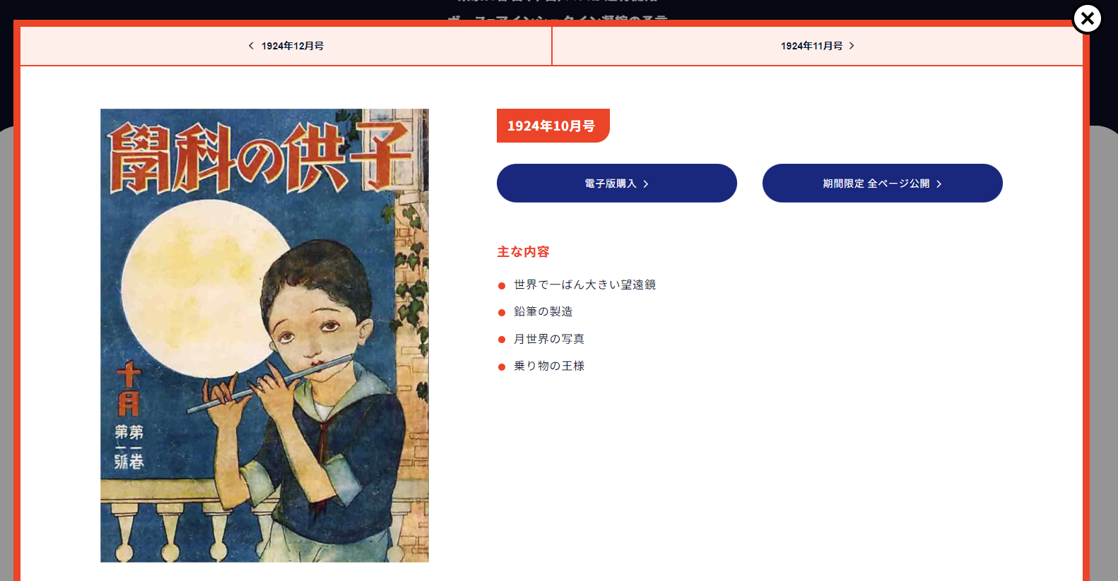 100周年サイトオープン記念企画1つめとして、創刊号となる1924年10月号電子版が全ページ無料で読めるキャンペーンを開催。「1924」と検索してタイムトラベルに出発。創刊号の表紙をクリックして、「期間限定 全ページ公開」ボタンから閲覧できます。