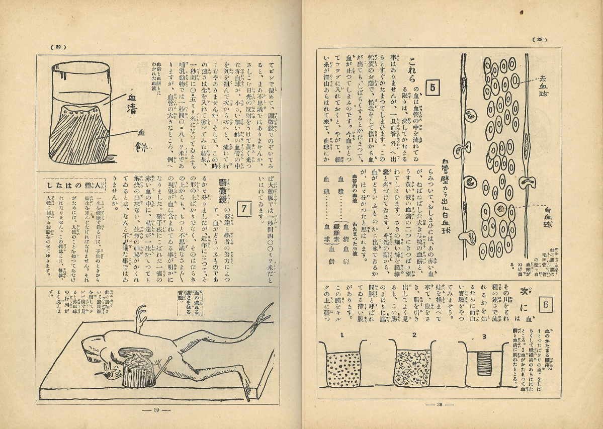 次のページをめくると、「血の流れる速さを知る実験」として、「カエルの腸をさいて腸間膜を出し、顕微鏡で見ると赤血球の行列がよく見えます」という説明とともに、なかなか衝撃のイラストが……。さすがに今はここまでは載せませんが、何か体験できるものを紹介するというスタンスは、今の編集方針に受け継がれています。