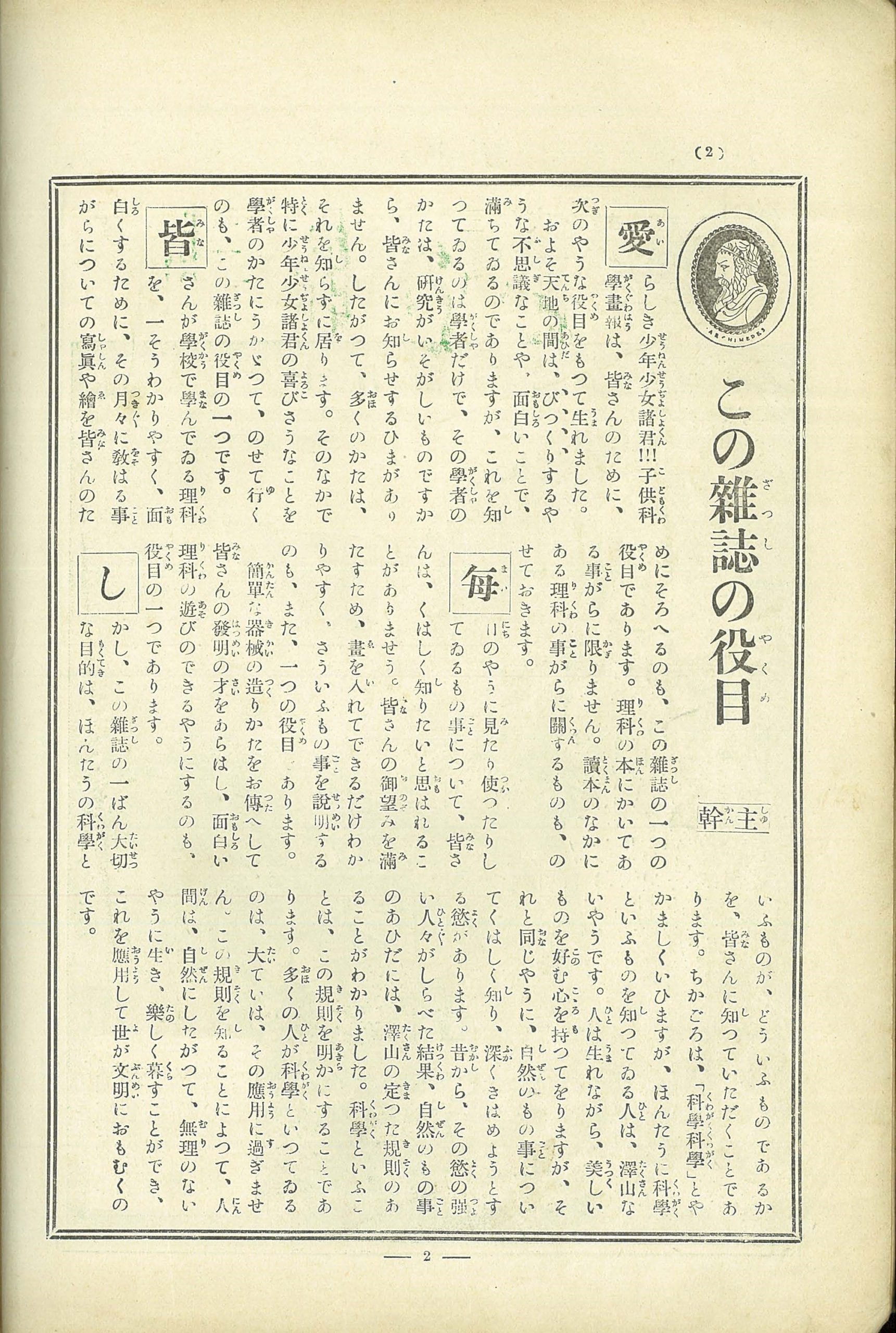 まず冒頭に、創刊編集長の原田三夫による「この雑誌の役目」という記事があります。100年間、今も変わらない『子供の科学』のコンセプトを伝えていて、編集部員はこの内容を心に刻んで雑誌をつくっています。