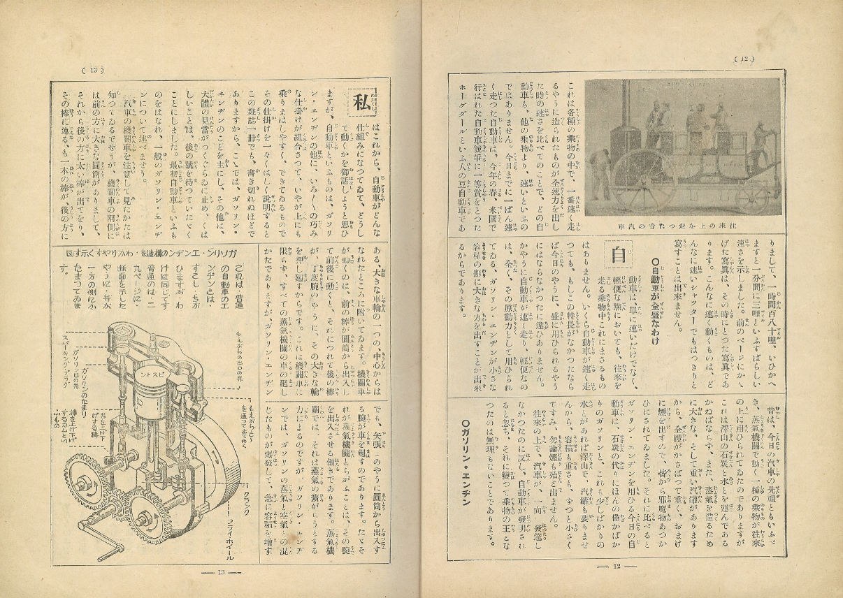 この後、エンジンの図解もまじえて自動車のしくみを解説していくわけですが、自動車が発明されるとたちまち世の中に広まり、街を走り回るようになったのは、この便利で扱いやすいしくみのおかげ、だから乗り物の王様になれた、と紹介しています。世の中の子供たちの興味から科学技術を解説する、とても『子供の科学』らしい創刊号の特集だなと思います。