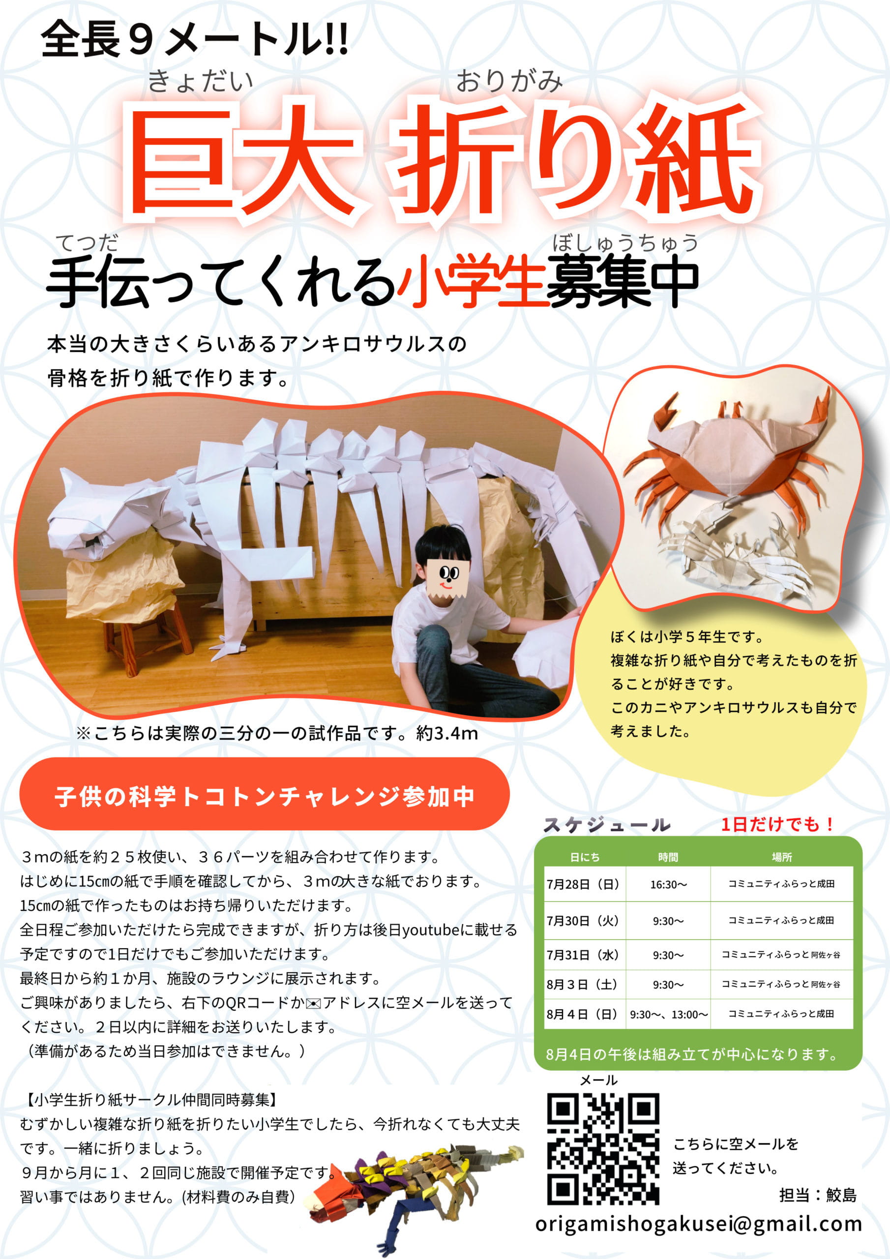そこで、鮫島さんの巨大折り紙の制作を手伝ってくれる小学生を募集します。
