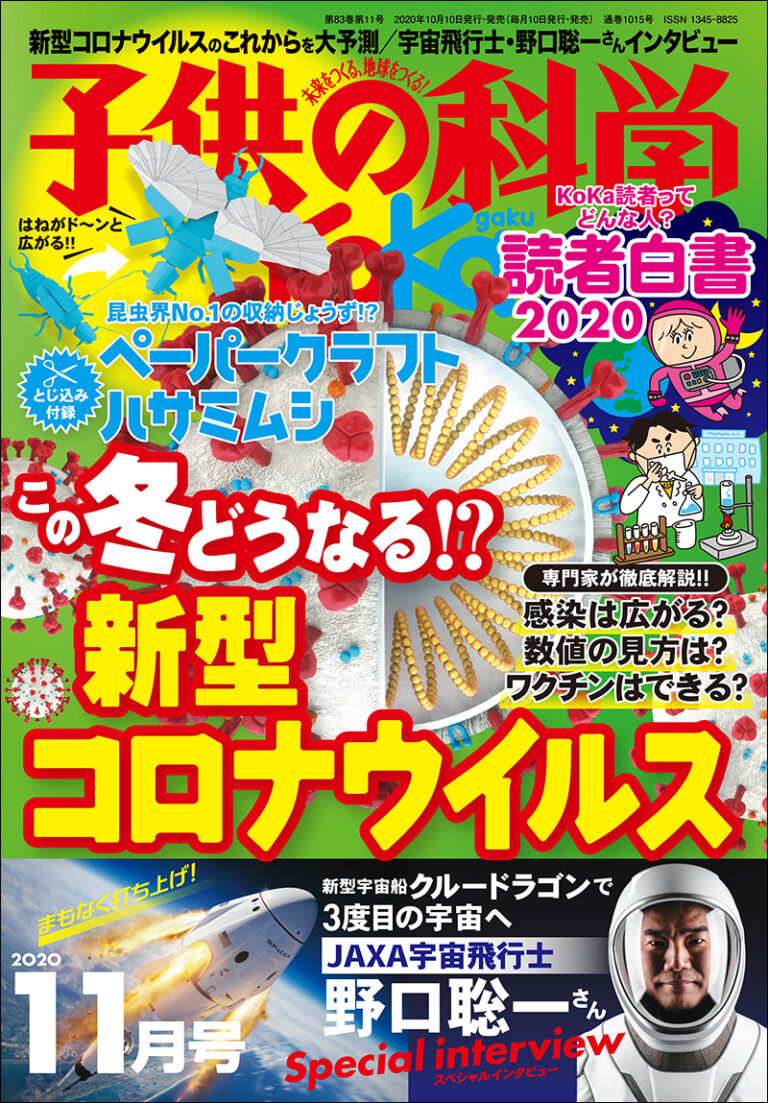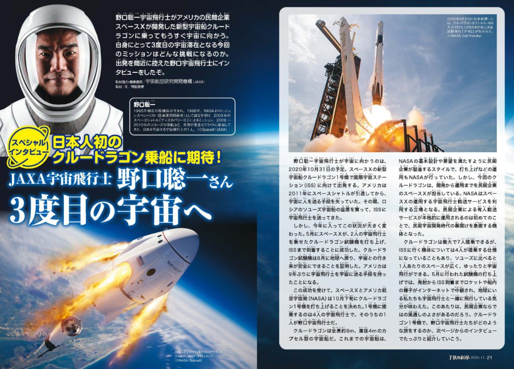 今回のISSでのミッションや、クルードラゴンのスゴさ、新型コロナウイルスの影響下での訓練の様子、新時代の宇宙開発のこと、そして読者の子供たちへのメッセージなどを紹介しているインタビュー記事は『子供の科学』2020年11月号に掲載されています。ぜひ記事を読み込んだ上で、これからの野口さんの活躍に注目しましょう!
