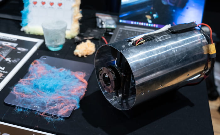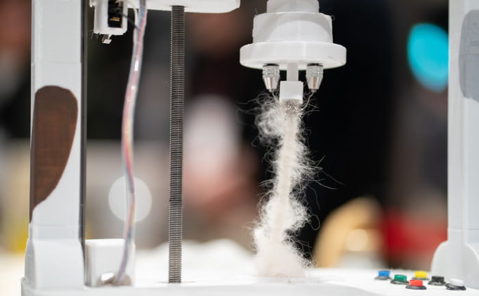 「CottonSketchPen」は、プラスチックを溶かして、わた状にして出力できるデバイスだ。ハンディサイズなので持ち歩くこともできる。プラスチックのわたを出力するしくみは、お祭りでおなじみのわたあめ機の構造を活用しているとのこと。ただし、わたあめ機は丸い形に出力されるけど、「CottonSketchPen」は一方向に出力するように変えているそうだ。