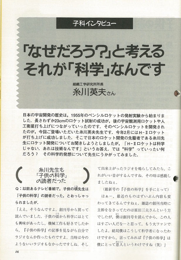 1994年5月号では、糸川英夫博士のインタビュー記事を掲載! 「科学」とは何かについてお話しを伺っているよ。ペンシルロケットの開発についても紹介。実は糸川博士も、KoKa読者だったんだって!