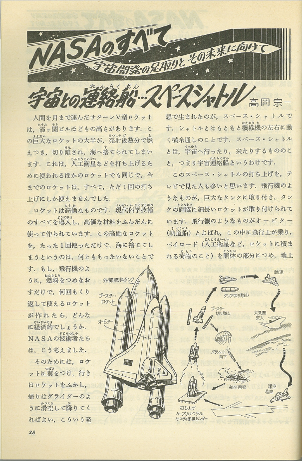 1983年6月号で、スペースシャトルについて紹介しているよ。打ち上げから地球上に戻ってくるまでの流れを説明している。