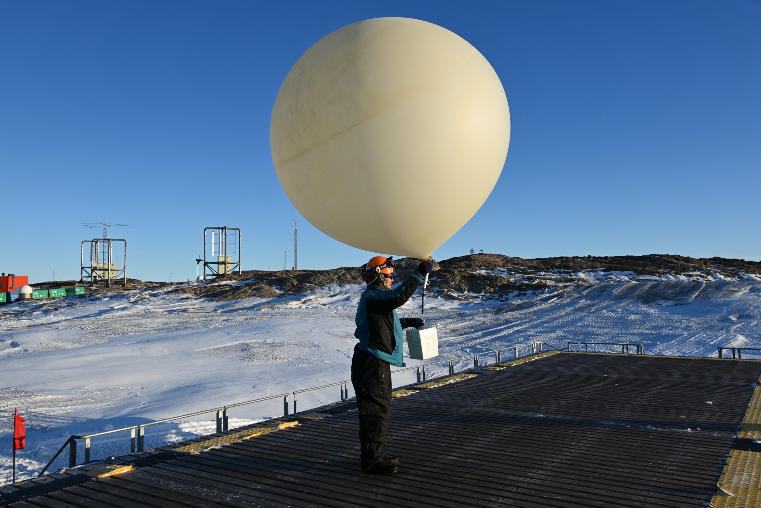 南極昭和基地では、いくつかの観測によって上空のオゾンの量を調べています。中でもゴム気球に観測測器を吊るすオゾンゾンデ観測は、オゾン層のある上空まで観測測器を上昇させて直接オゾンを観測することができます。オゾンホールの規模を調べるのにたいへん有効な観測方法です。
