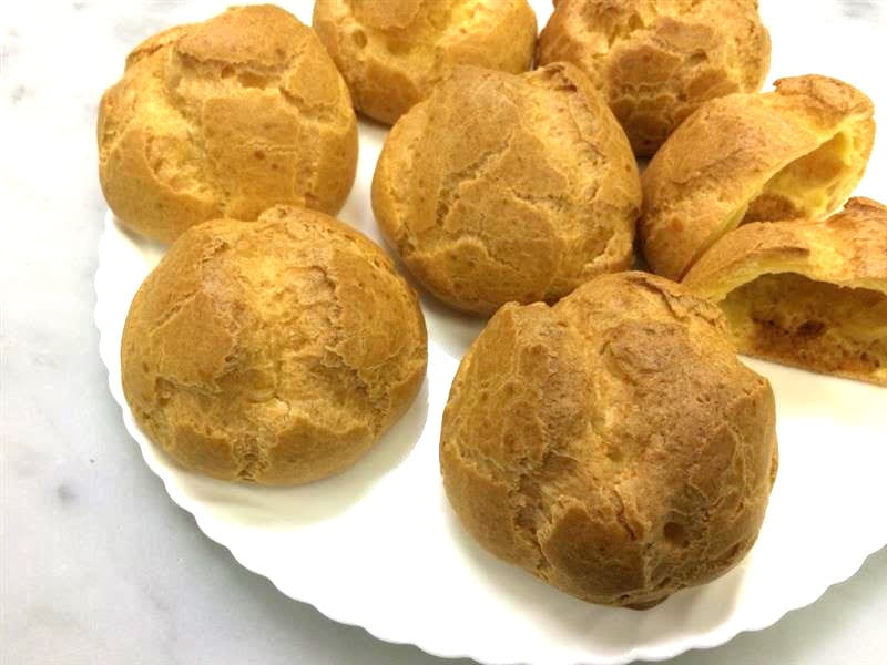 7.シュー生地を下から2/3高さで斜めに1/2くらいまで切る(切り落とさない)。カスタードクリームを絞ってつめる(スプーンでつめてもよい)。
