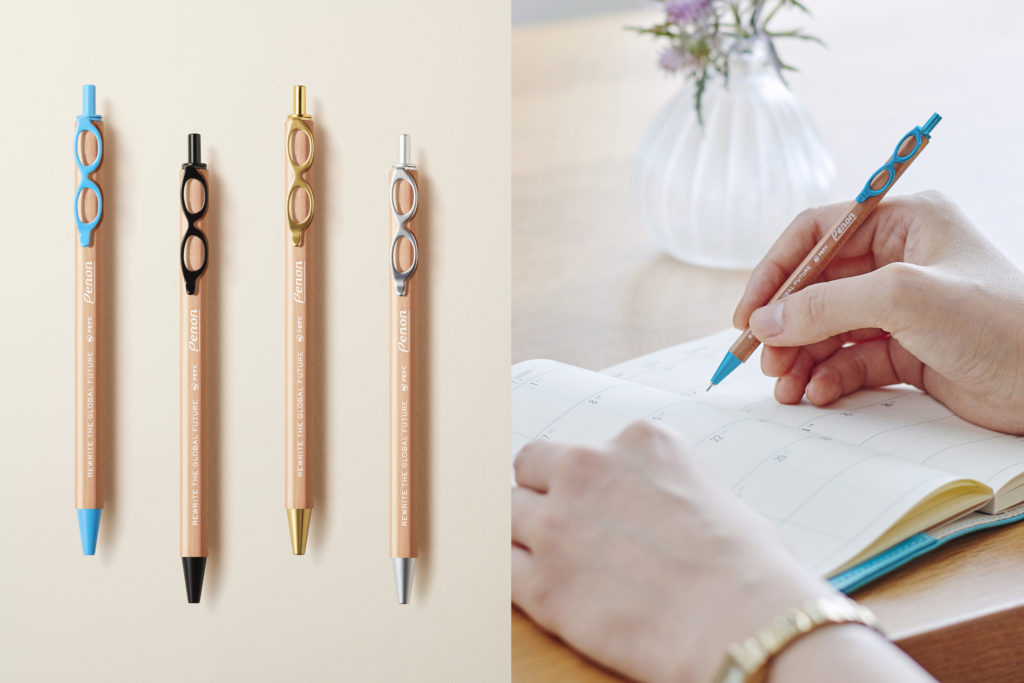 された木材を本体に使い、使い終わったペン芯をリサイクルできるボールペンだ。使うほど手になじむボールペンで、ペン芯はメーカーが回収してリサイクル。包装材