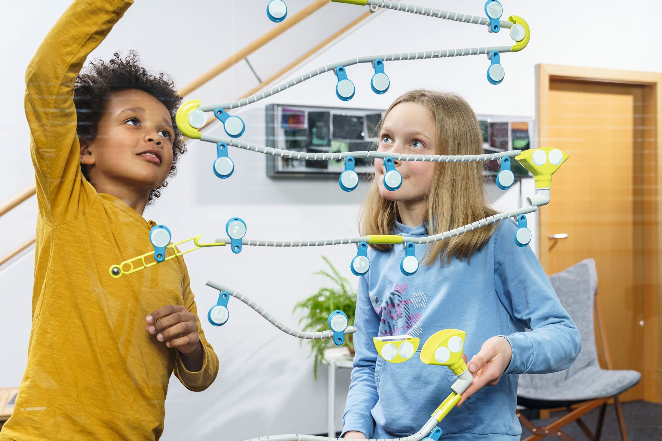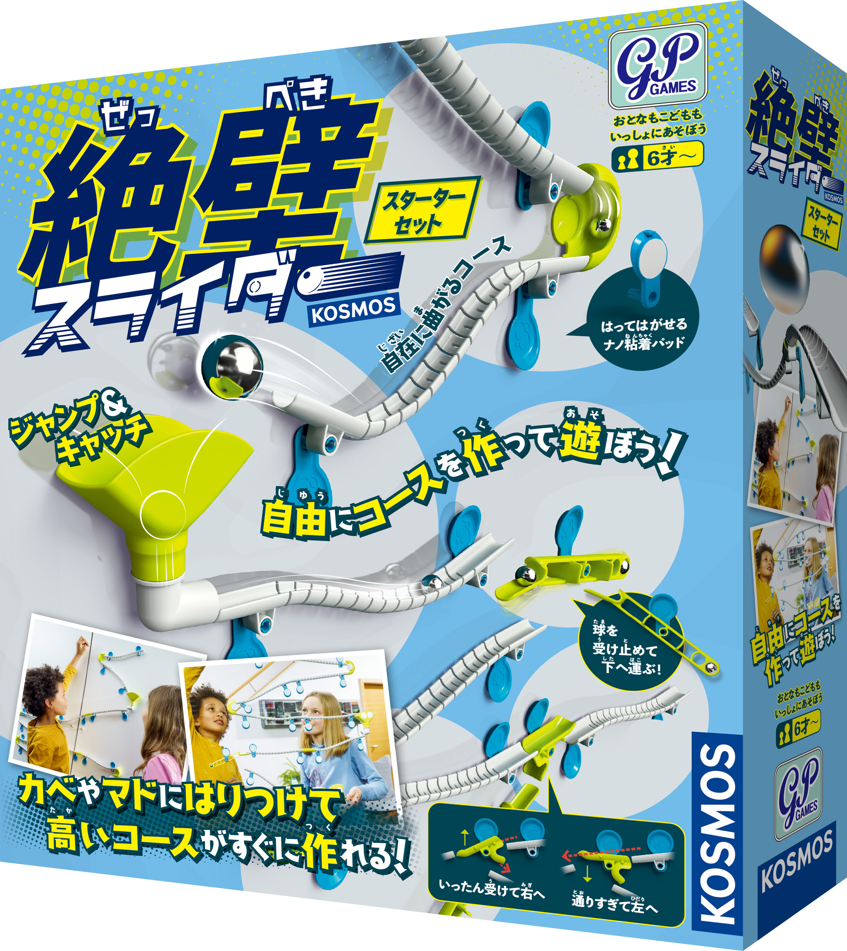 壁や窓に貼り付けて、カンタンにコースがつくれる「絶壁スライダー」。どうすれば上手に球を転がせるのか……、貼って剥がせるレールを使って、何度でもコースをつくり直して挑戦できる。縦に高さのあるコースをつくったり、横に長~いコースをつくったり、コースに角度をつけてボールを早く動かしたり、ジャンプさせたりすることも。キミの想像力や集中力、思考力を鍛えながら、自分だけのコースを完成させよう。