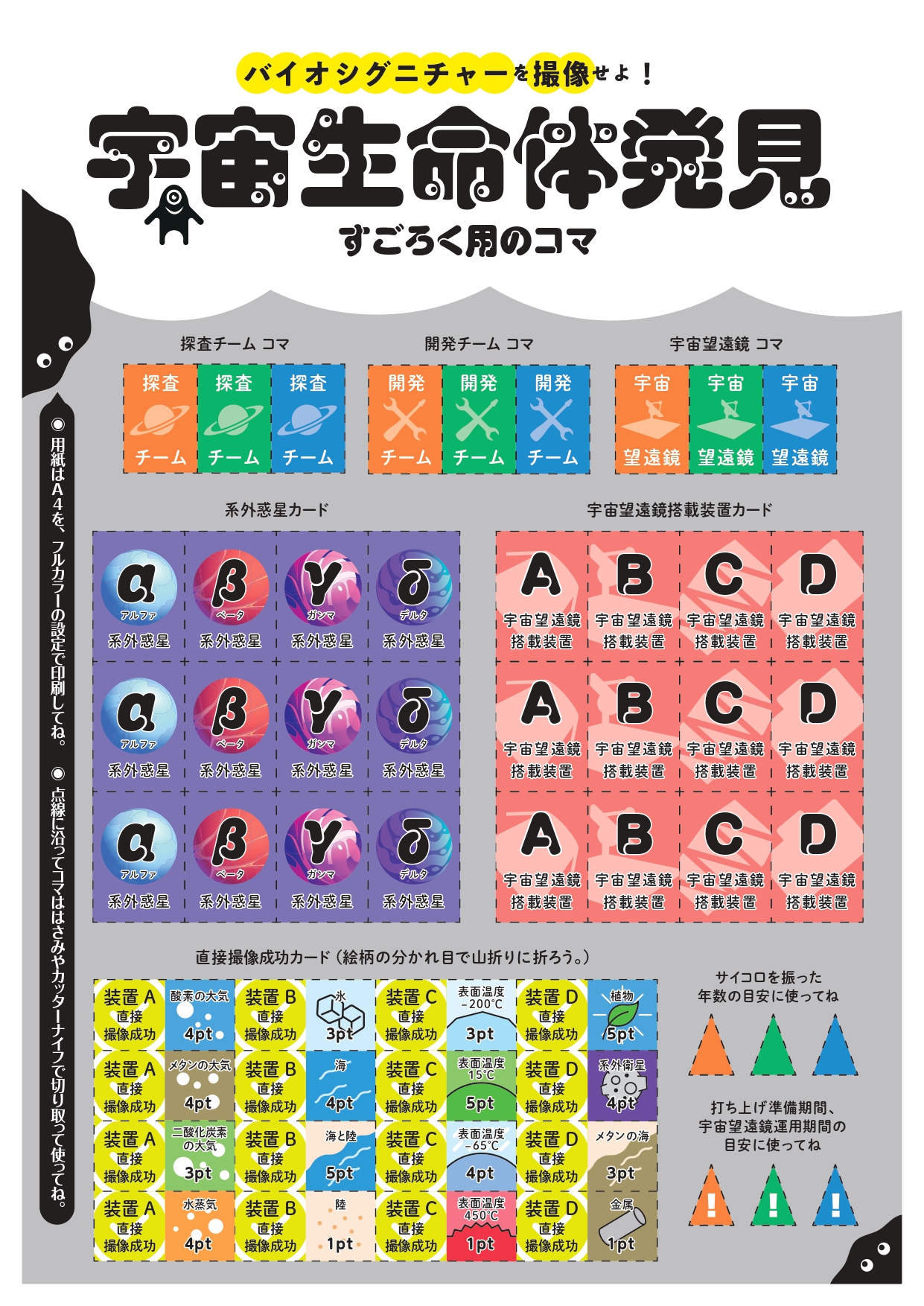 『子供の科学2023年8月号』の別冊付録「バイオシグニチャーを撮像せよ! 宇宙生命体発見すごろく」で遊ぶためのコマのダウンロードページだよ。遊び方は本誌の88ページを要チェックだ!