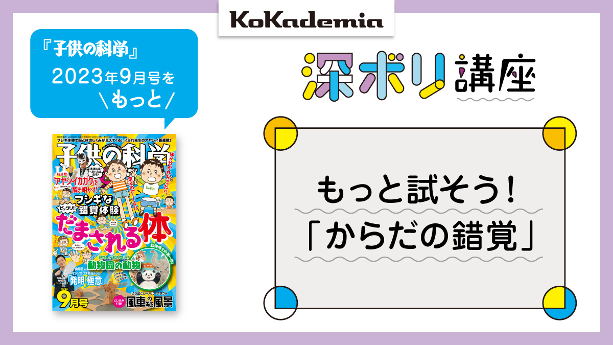 『子供の科学』2023年9月号の「ビックリ!! フシギな錯覚体験 だまされる体」をさらに深ボリ。本誌では紹介しきれなかった「からだの錯覚」の体験方法を紹介していきます。ぜひ試してみましょう! 『子供の科学』2023年9月号の特集では7種類の「即錯《 […]