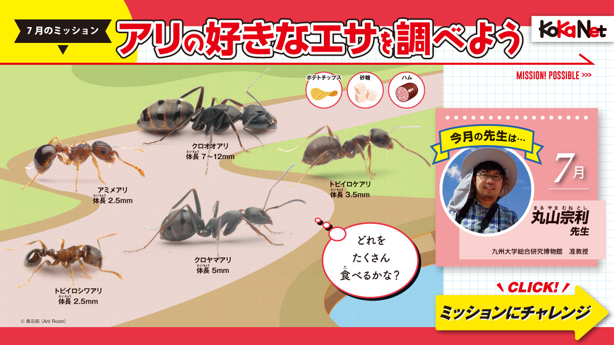 子供の科学2023年1月号別冊付録「科学ミッションカレンダー」7月のミッションページ。公園や道路脇で見かけるアリ。身近な存在だけれど、好きなエサってなんだろう? 丸山先生からのミッションは、「アリの好きなエサを調べよう」。とても手軽にできる調査だか […]
