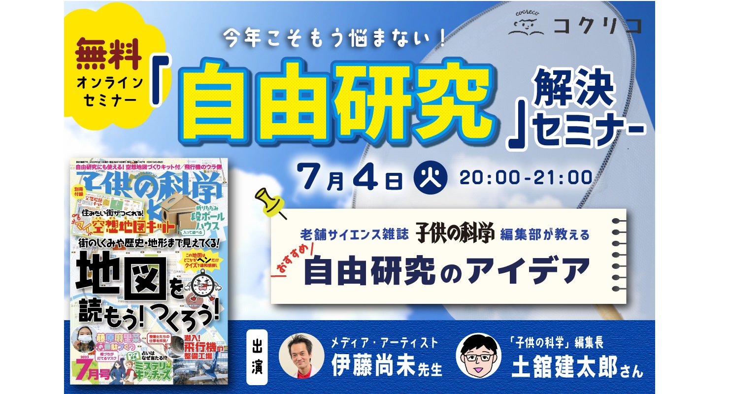 2023年7月4日(火)、講談社が運営する「子育て」と「本」の情報サイト「コクリコ」が開催する無料オンラインセミナー「今年こそもう悩まない!「自由研究」解決セミナー」に、連載ポケデンでおなじみ伊藤尚未先生と『子供の科学』編集長のツッティーが出演。保 […]
