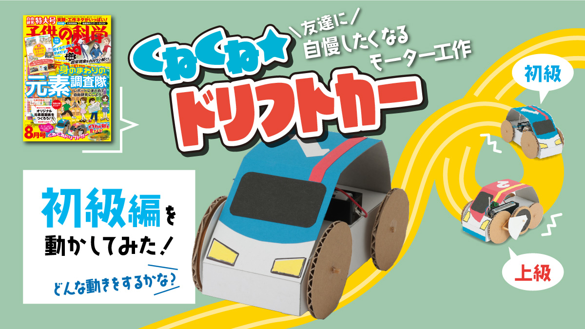 『子供の科学』2022年8月号「くねくね★ドリフトカー」特集で紹介したクルマを動かしている動画です。こちらは初級編。ボディに車輪とモーターをつけて、真っすぐに走ります。かなりスピードが出るので、広い場所で走らせるのがおすすめ!