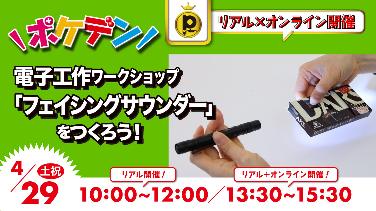 会場には直接行くことができない、電子工作のワークショップってどんなことをやるのか見てみたいというみんなには、オンラインでの配信もあるよ。オンライン配信の参加については、「2.オンライン配信」の内容を読んで申し込んでね。ポケデン「フェイシングサウンダー」をつくりたくなったら、「KoKa Shop!」で部品セットを購入できるよ(4/10発売)。