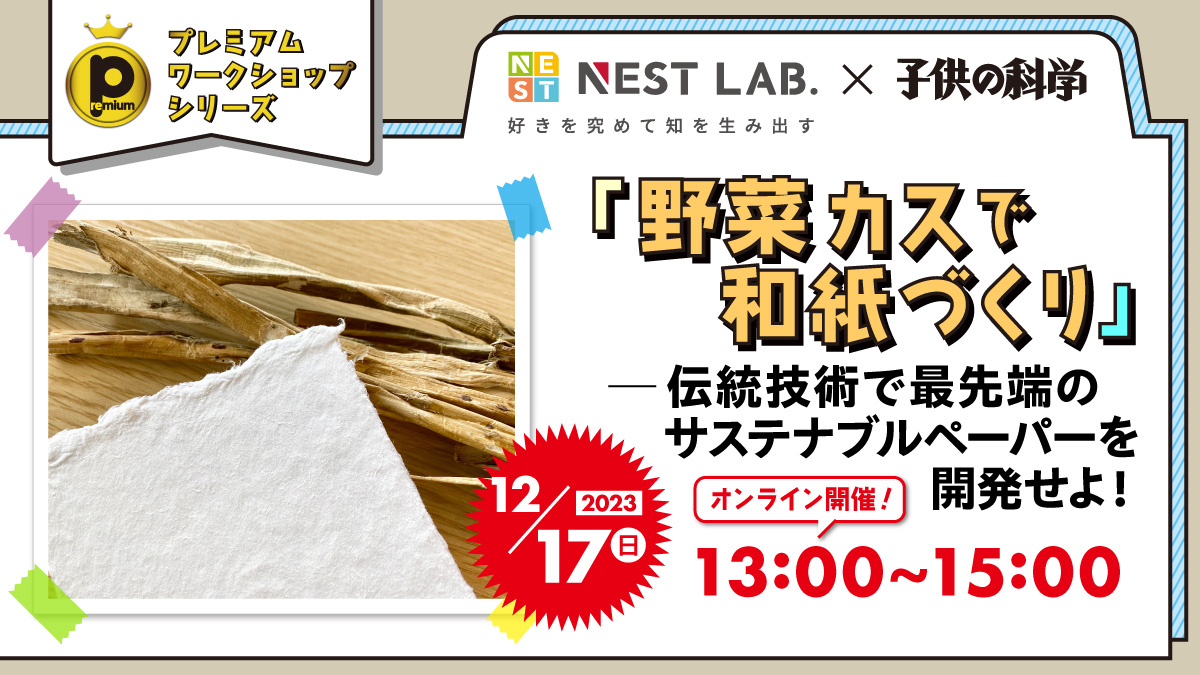 小中学生の才能発掘研究所「NEST LAB.(ネストラボ)」とコラボレーションして、身近な科学やものづくり、テクノロジーを学んでいくプレミアムワークショップシリーズ(月1回を予定)。12月17日(日)は、野菜カスでサステナブルペーパーをつくるワークショップです!