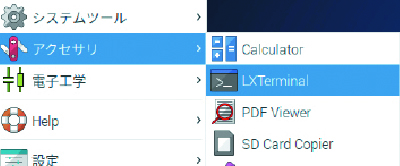 CUIの方法を使うときは、「LXTerminal」を使うよ。スタートメニューの「アクセサリ」から「LXTerminal」を選ぼう。画面左上の黒い四角形に白字で「>_」と書いてあるアイコンをクリックしても大丈夫。