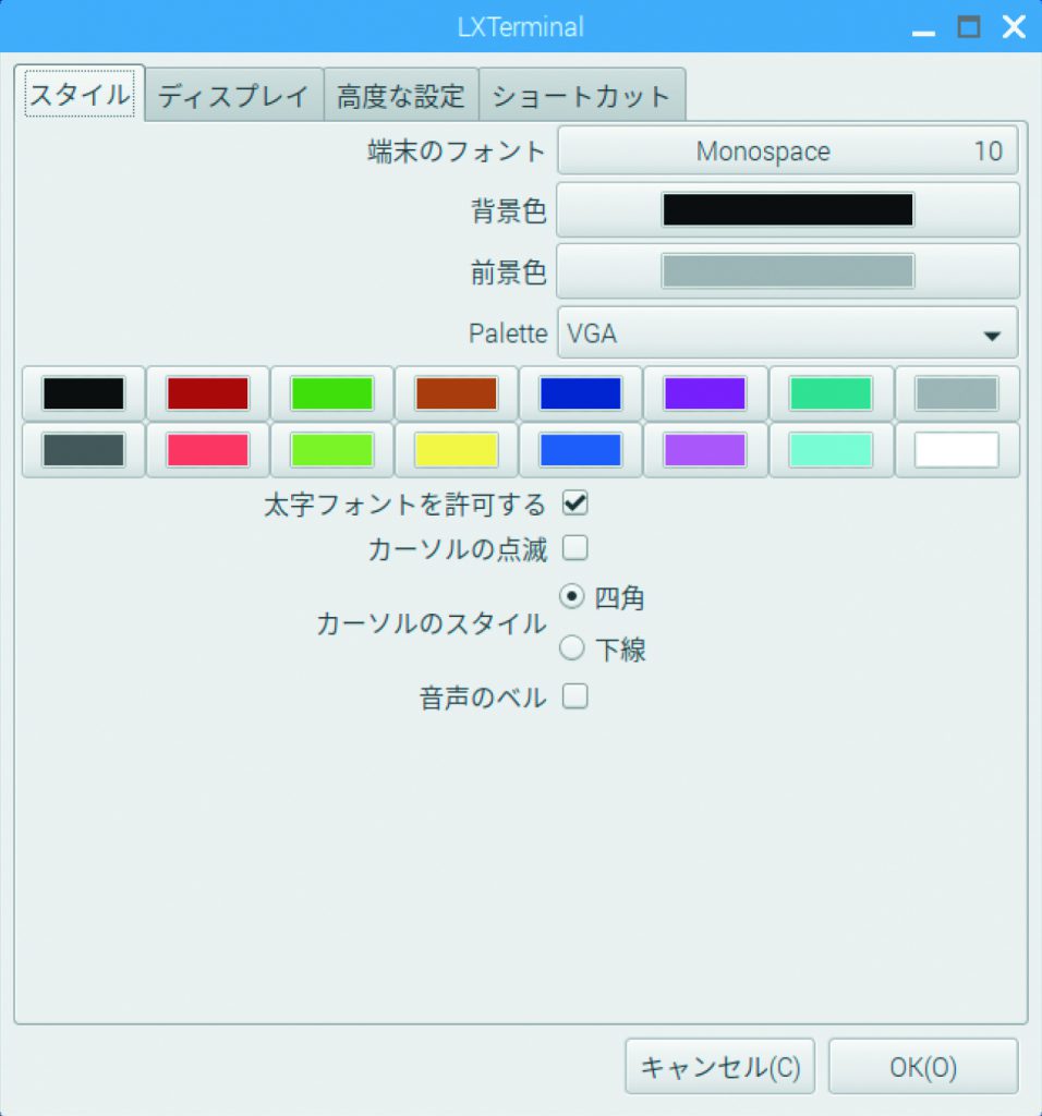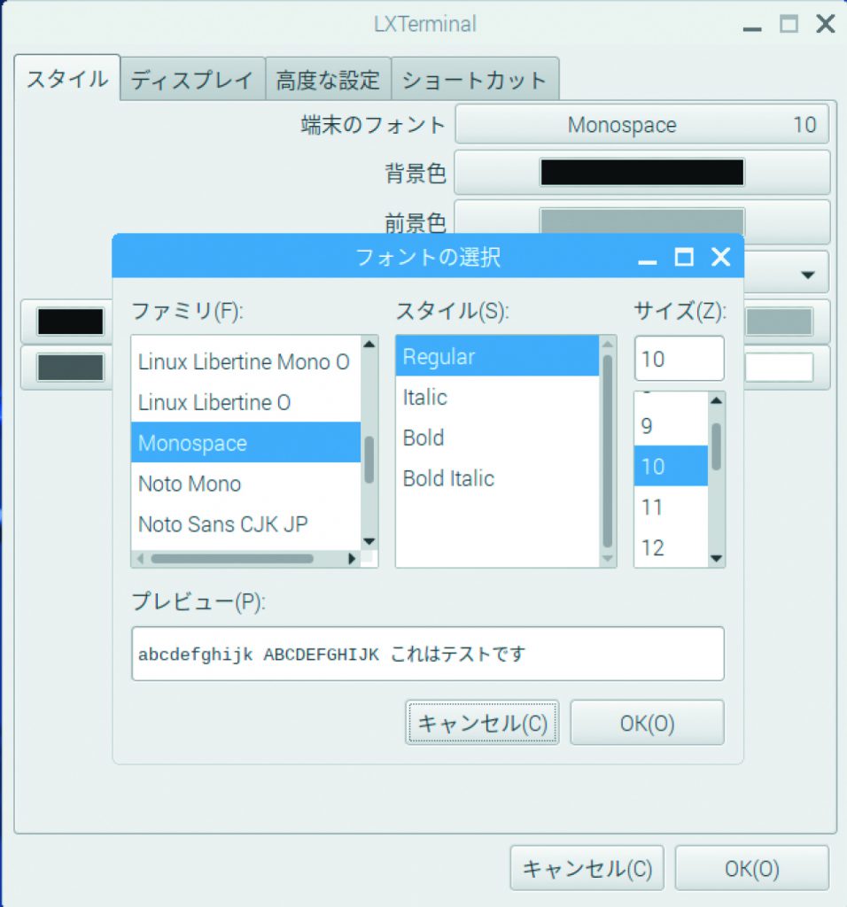 しよう。「Monospace」は、文字の幅がすべて等しい等幅フォントだ。「LXTerminal」で使うときは、等幅フォントが使いやすいので、「ファミリ」は変えないようにしよう。