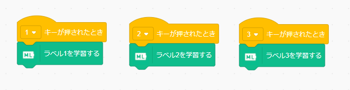 学習をするときは、「ラベル1を学習する」ブロックを使うけれど、しくみとしては、「ラベル1を学習する」ブロックが実行されたときに、ステージに表示された画像をラベル1として学習する。「ラベル1の枚数