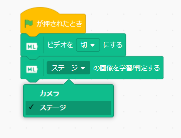 はカメラの画像を学習する設定になっているのが、今回はステージに描いた画像を学習させるので「カメラの画像を学習する」ブロックを切り替えて「ステージの画像を学習する」に変えて、Webカメラもオフにしておこう。これで学習する部分の準備はOKだ。