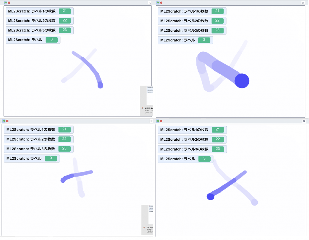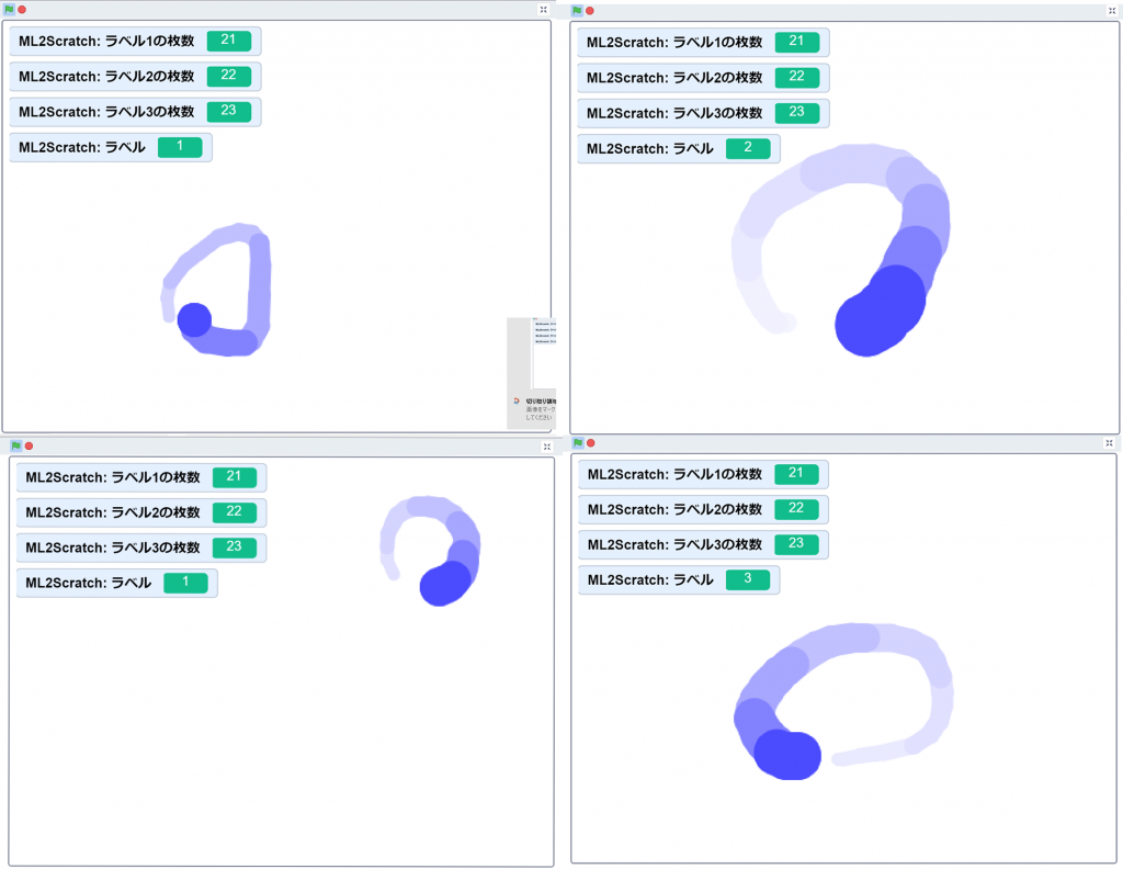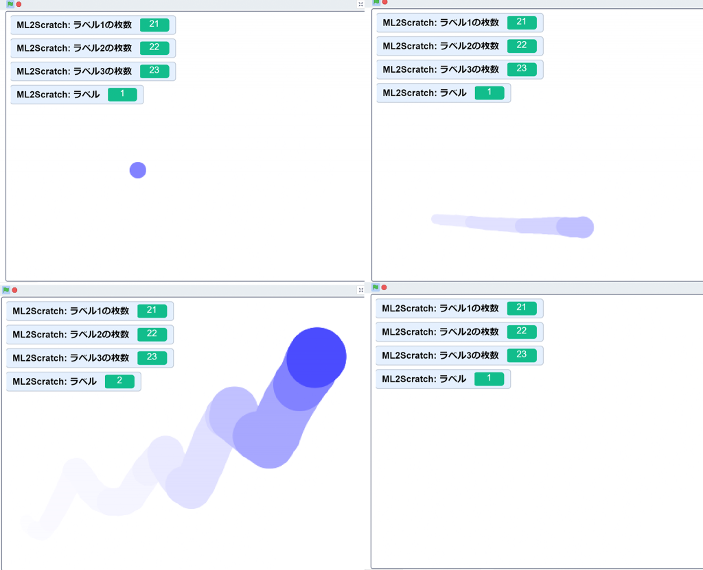 これで、ステージの上をマウスで線を描いてみると、「ML2Scratch:ラベル」のラベルは1~3まで変わるようになるだろう。