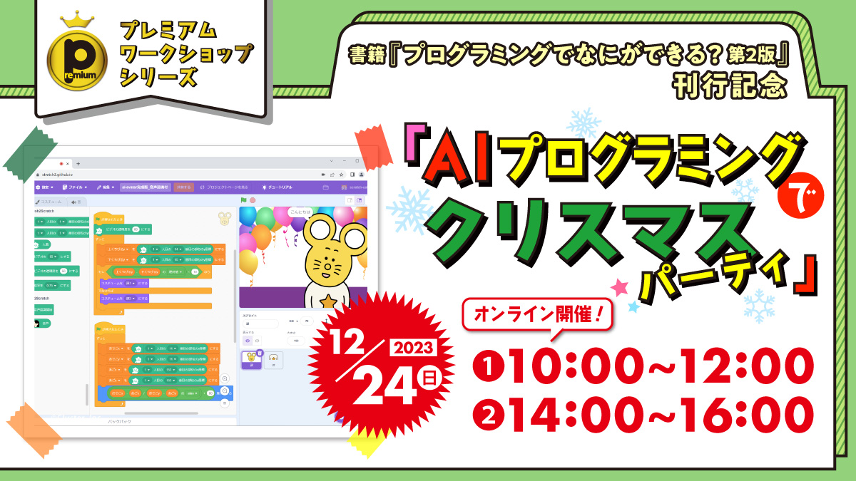 本のPart2で紹介した「AIコスプレ」と「AIアバター」にチャレンジします! クリスマスらしいコスプレやアバターの素材も準備予定。参加者は豪華なプレゼントがもらえるチャンスも!(抽選となります)。みんなで楽しくプログラミング・クリスマスパーティーを楽しもう!
