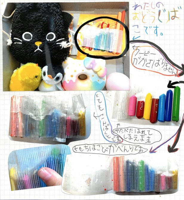 ①おどうぐばこにものがたくさんでクーピーのはこがじゃま。