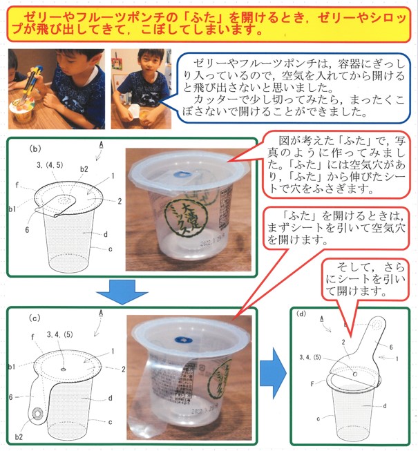 まず、まとめ方が素晴らしいです。写真や図がきれいにレイアウトしてあって見やすく、内容がすぐにわかります。試作もばっちりしてあって、解決したい課題とその方法が明快です。ゼリーを開けたら中身が飛び散ってしまった……という体験は多くの人が経験します。たくさんの人が生活の中で抱えている課題を選んでいる点も高評価です。