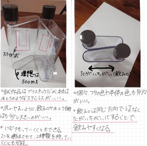 このアイデアは、小学生など小さい子供がうまく使えるように……という配慮をして、身近な課題の解決に取り組んでいるところがとても素敵ですね。飲み口を互い違いにして、飲みやすくなるようにしています。連結できるパーツをつけると、金型が2種類必要になってコストが上がるという面もあるでしょう。小学生が普段使いできる価格帯、大きさに収めるための工夫などを具体的に詰めていくのもよさそうです。