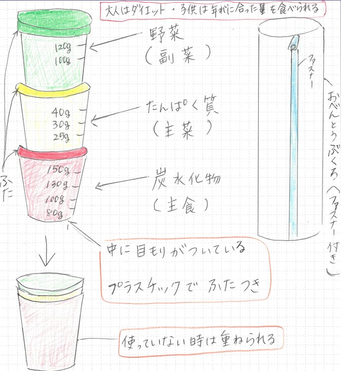 韓国の紙コップダイエットをもっとエコにした食器です。3つのカップがあってそれぞれ、炭水化物、たんぱく質、野菜のおかずを入れられます。大人はダイエットできます。子供は年齢に合った量を入れられます。プラスチックでふたつきです。