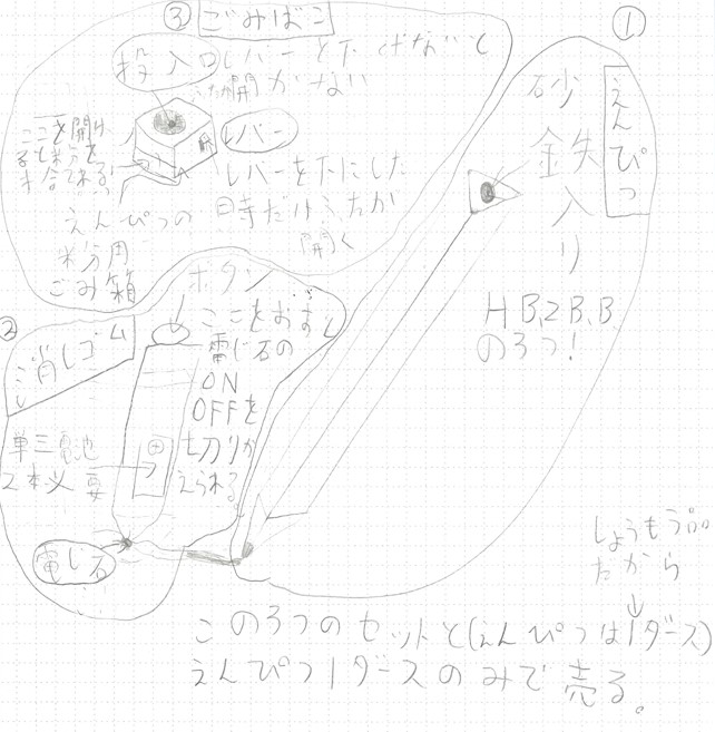 電磁石で本当に筆跡を消すことができるのか、単三電池入りの消しゴムの重さはどれくらいかなど気になる点もありますね。この図面のままに試作品をつくるのは大変ですが、個々の要素にわけて、実現度はどれくらいか少しずつ試してみるのもよいでしょう。将来、消しゴム問題で悩む人がいなくなるようにぜひ取り組んでいってほしいですね。