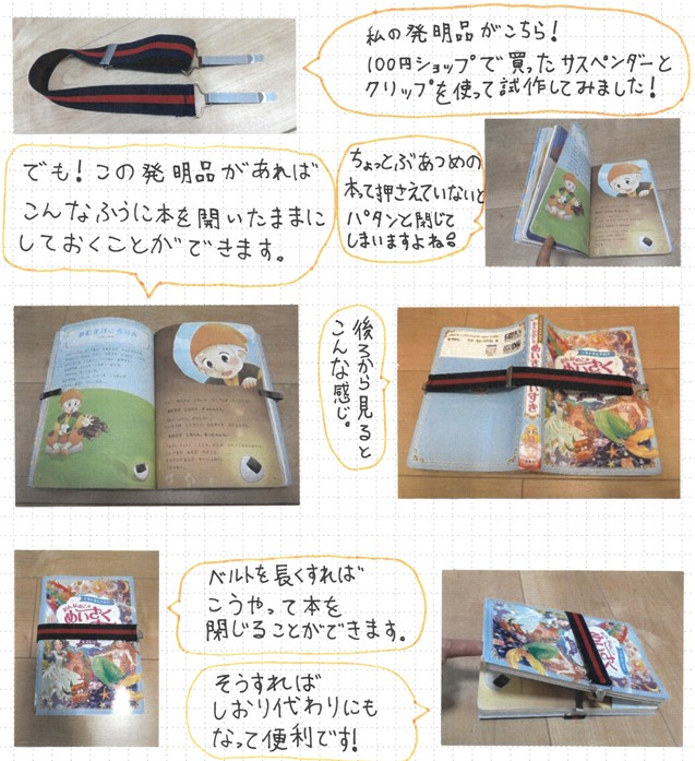 ドライヤーを立てたいという場面、結構多くの人にあるんじゃないかと思います。実際机に置けるドライヤーや専用スタンドなども商品化されていますね。もっと小さくて手軽で安いものがあったら、人気が出そうです。竹田くんはまだ5歳とのこと。このような日常の課題を見つけて、解決方法を考えていくクセをつけたら、きっと発明力がぐんぐん伸びていくと思います。今後に期待しています!