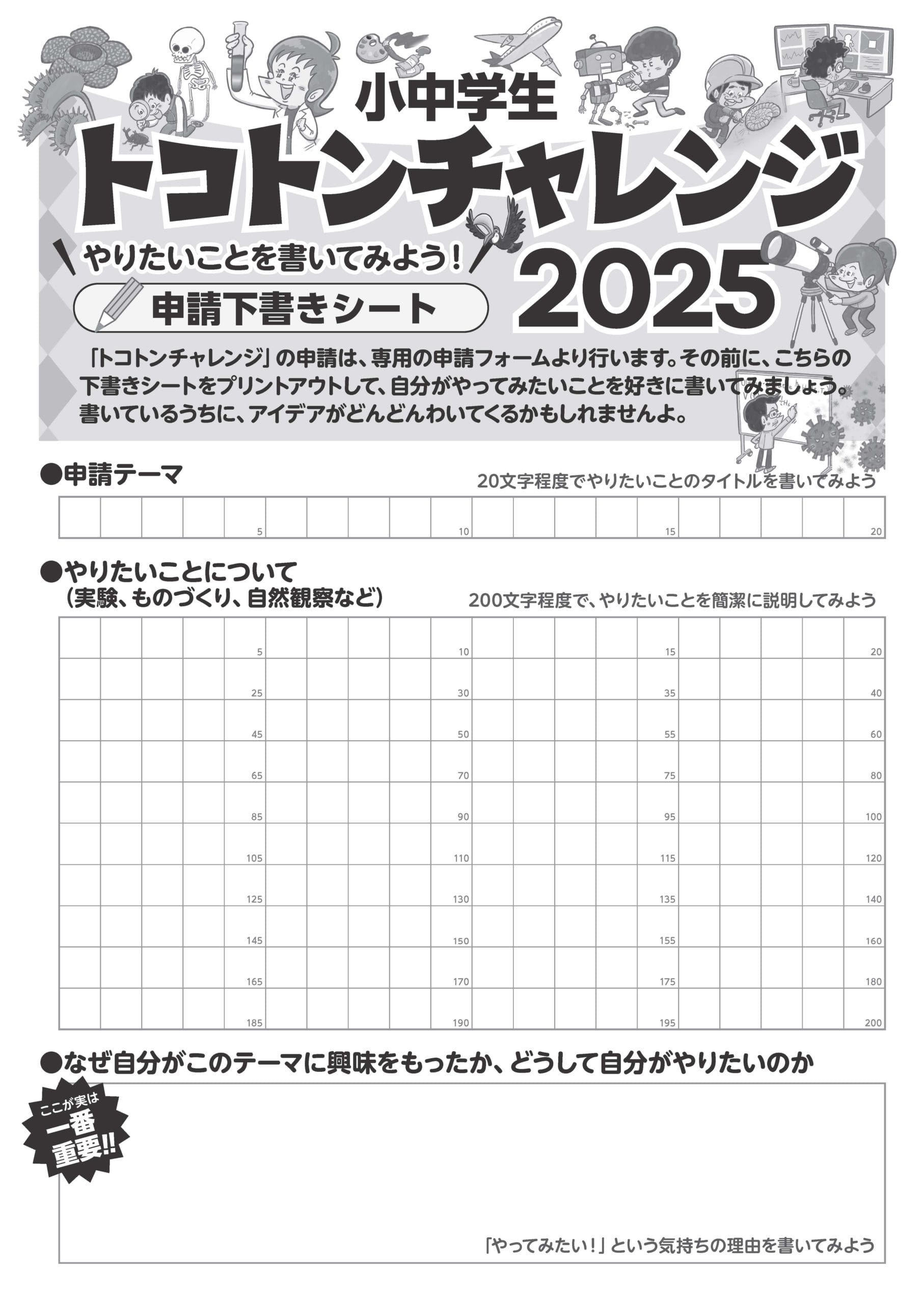 「トコトンチャレンジ」の申請は、専用の申請フォームより行います。その前に、こちらの下書きシートPDFをダウンロードの上、プリントアウトして、自分のやってみたいことを好きに書いてみましょう。書いているうちに、アイデアがどんどんわいてくるかもしれませんよ。