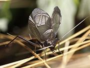 全長約65mm 本州西部〜南西諸島に棲息。西日本の平地で最も多いセミ。主に午前中、「シャンシャン…」と鳴く。街路樹に群れることもめずらしくない。