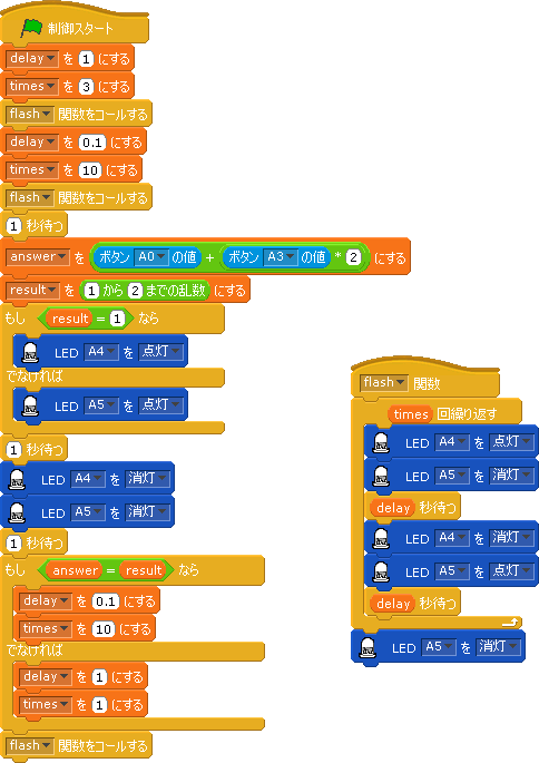 この関数を呼び出すには[関数をコールする]を使う。「▼」でメニューを出し、「flash」を選ぼう。これを[制御スタート]の下にある、変数の代入ブロックの下につければ完成だ。